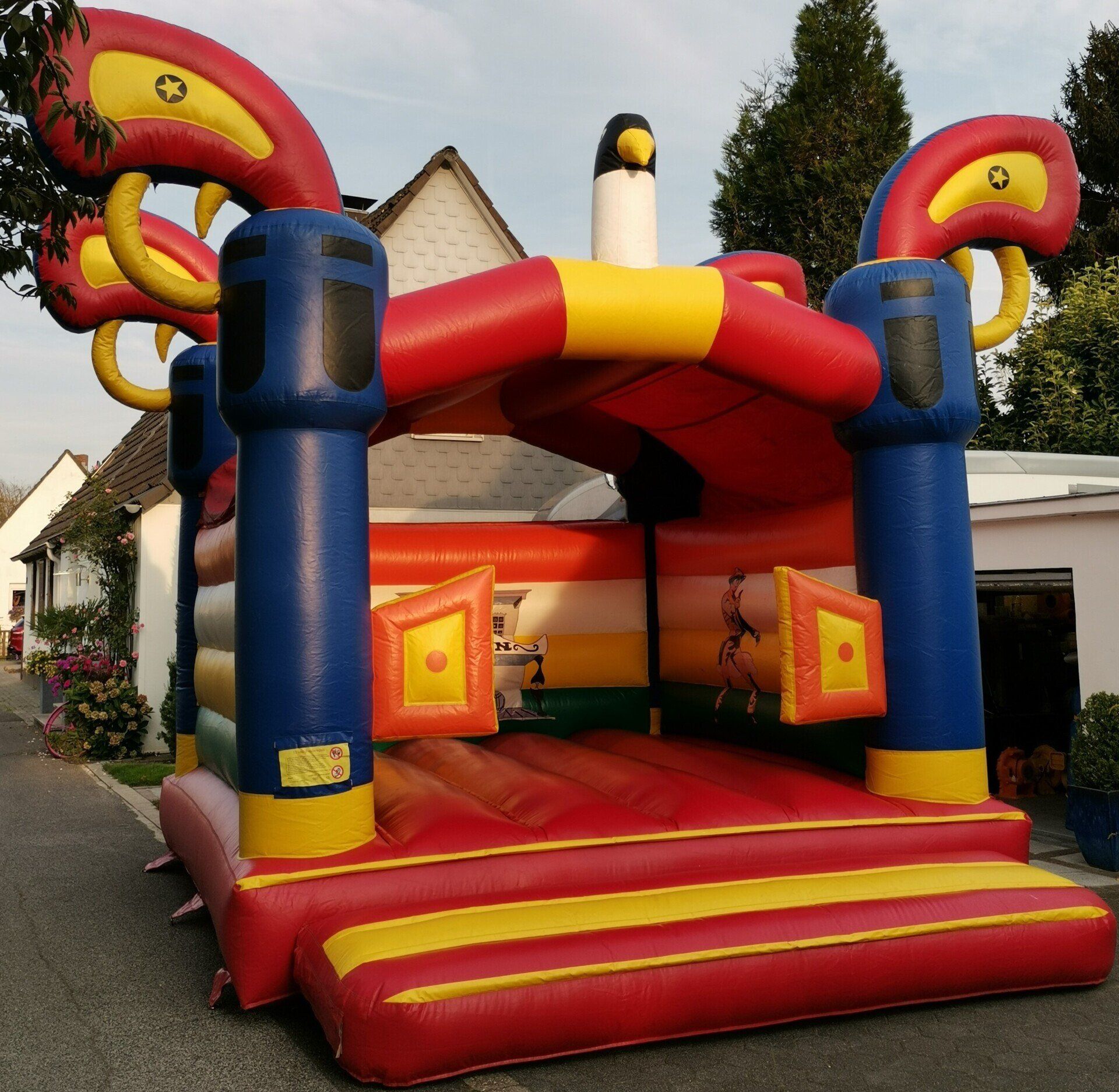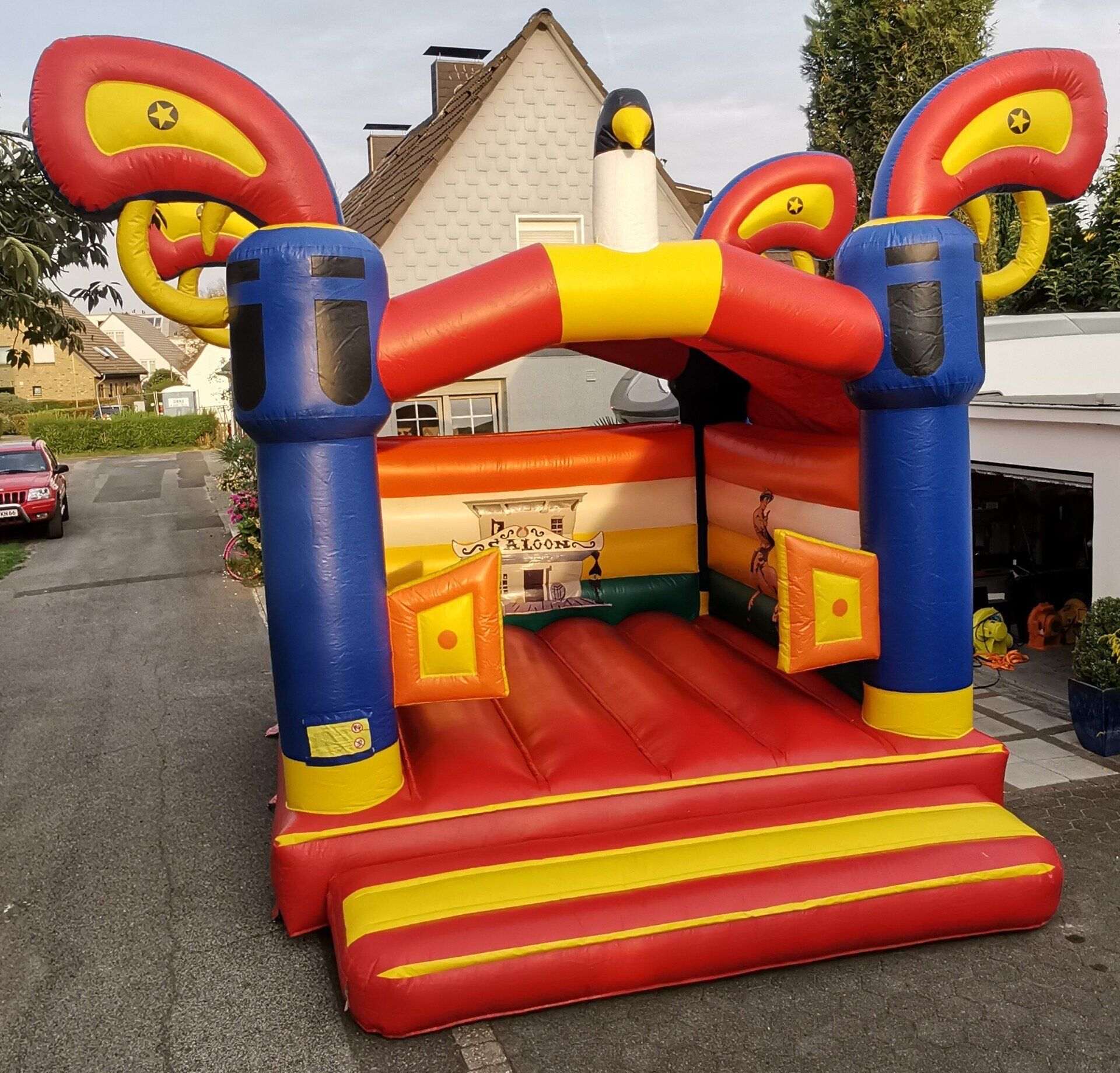 Sie planen einen Geburtstag, eine öffentliche Feier, Siedlerfest oder Fußballturnier. Dann ist unsere Hüpfburg Saloon genau das richtige für Sie. Die Hüpfburg hat eine Größe von 4 m x 5 m und eine Hüpffläche von 3,5 m x 3,5m. Gleichzeitig dürfen 8-10 Kinder auf die Burg. Unser Spitzenmodell ist aus schwerer LKW Plane und somit äußerst robust. Bei einer Höhe von 5m ist diese Burg unsere höchste Burg. Die Hüpfburg Saloon hat außerdem ein Regendach.
