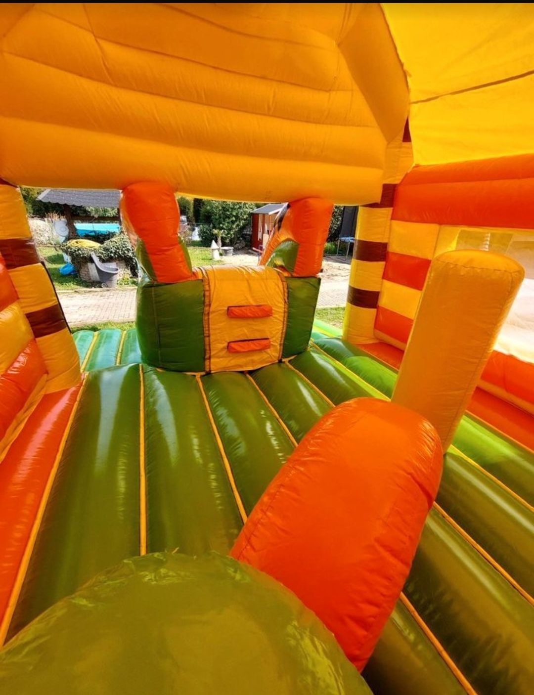 Sie planen eine öffentliche Feier, Siedlerfest oder Kindergartenfest. Dann ist unsere Hüpfburg Tiger genau das richtige für Sie. Die Hüpfburg hat eine Größe von 4 m x 6,3 m und eine Hüpffläche von 3,5 m x 3,5m mit einer tollen Rutsche. Gleichzeitig dürfen 8-10 Kinder auf die Burg. Unser Spitzenmodell ist aus schwerer LKW Plane und somit äußerst robust. Bei einer Höhe von 5m ist diese Burg kaum zu übersehen. Die Hüpfburg Tiger hat außerdem ein Regendach.